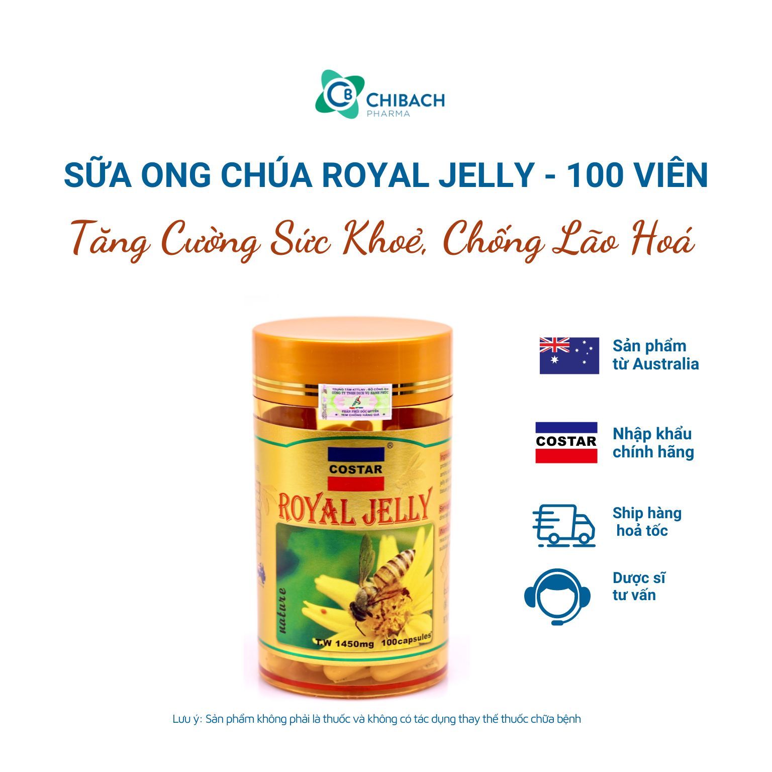 Viên uống sữa ong chúa Royal Jelly, tăng cường sức khoẻ, chống lão hoá của costar nhập khẩu chính hãng, úc, hộp 100 viên